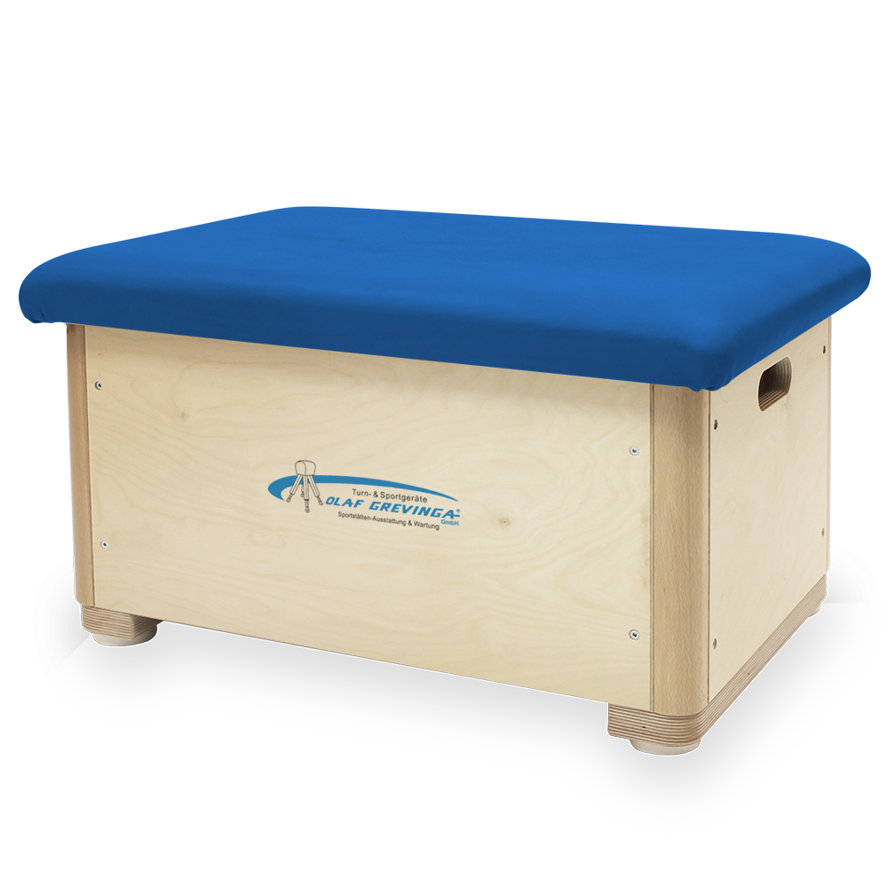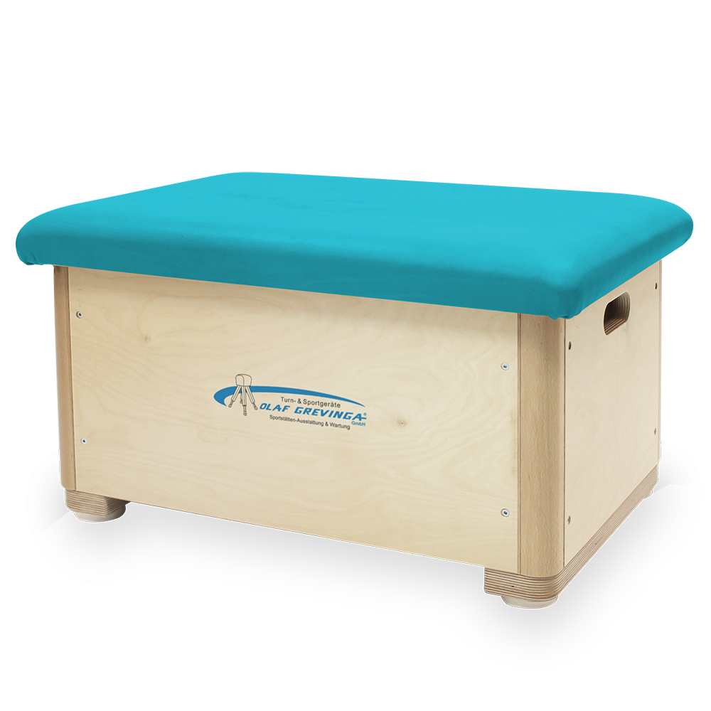 Kleiner bunter Sprungkasten aus Birke-Multiplex gefertigt. Die Kastenteile sind an den Ecken keilgezinkt und fest verschraubt. Die Deckelplatte ist mit Kunstleder bezogen und sehr robust. Im Deckel befindet sich eine Schaumstoffeinlage aus Verbundschaum, mit einem Raumgewicht von 160 kg/m3. Zur Schonung des Hallenbodens besitzt er zusätzlich nicht färbende Gummipuffer unter den Standschwellen. Alle erforderlichen Öffnungen sind an den Sprungkästen bereits vorhanden.