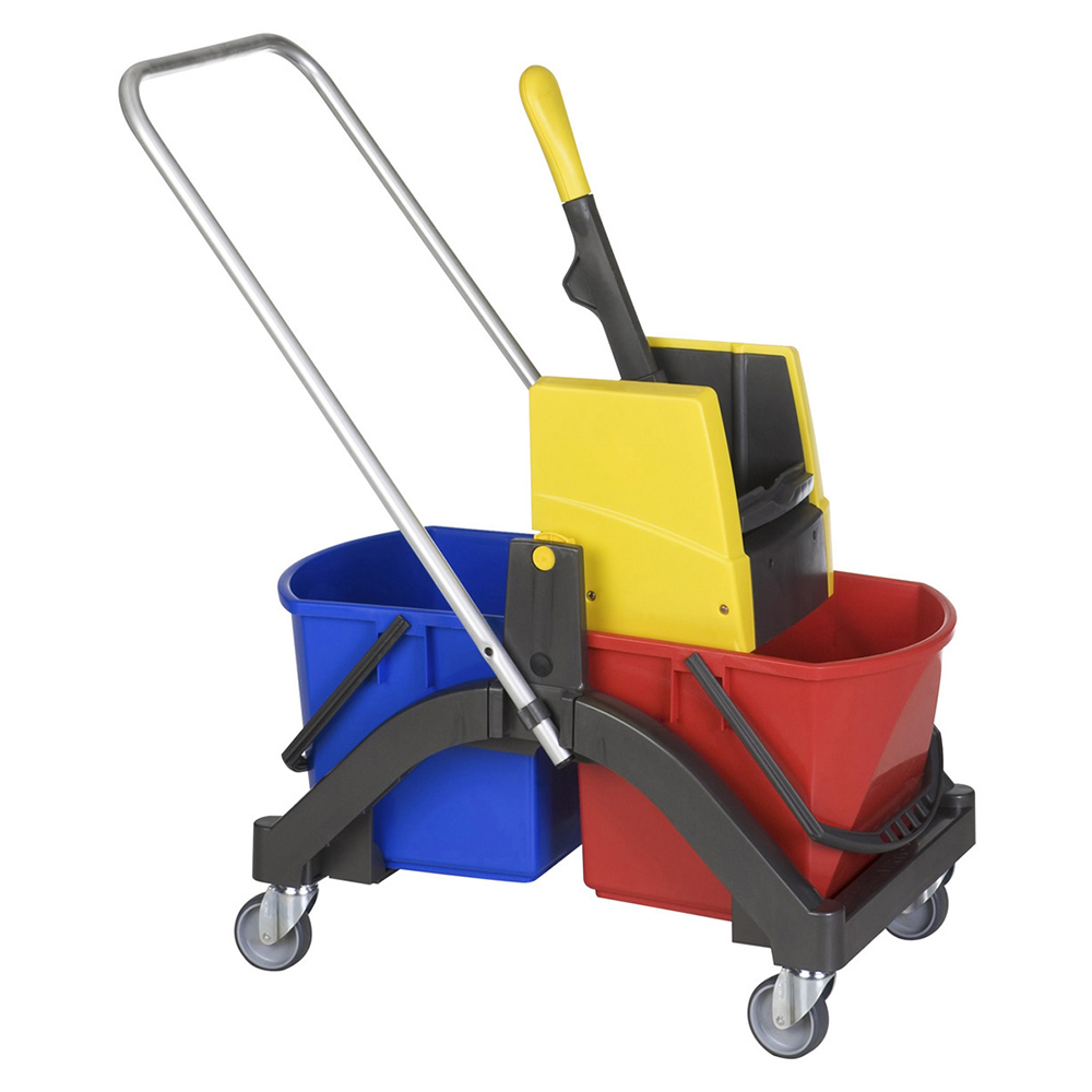 Praktischer Nasswischwagen, sehr leicht zu manövrieren, mit 75 mm großen Lenkrollen. Aus hochfestem Kunststoff und dadurch sehr langlebig und gewichtssparend. Die Deichsel sorgt für ein bequemes schieben in aufrechter Köperhaltung.
